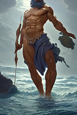 Poseidon - The Hanged Man: Poseidon, the god of the sea, symbolizes introspection, sacrifice, and surrender. In The Hanged Man card, Poseidon is depicted suspended upside down, indicating the need to view situations from a different perspective. The calm sea and stormy clouds convey the dual nature of Poseidon's realm
